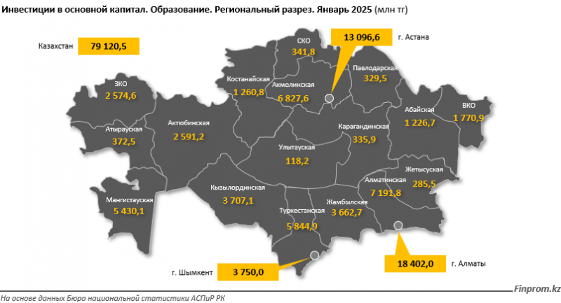 инвестиций в сфере образования совокупно пришлось лишь на Алматы и