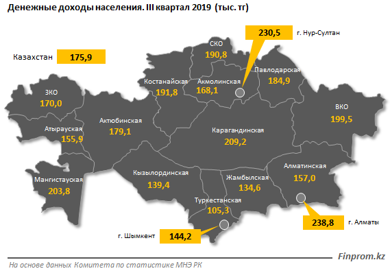 Среди регионов страны наибольшие доходы у жителей Алматы: 238,8 тыс. тг — на 35,8% больше среднереспубликанского значения. За год сумма возросла на 5,7%.