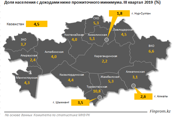 Меньше всего населения с доходами ниже прожиточного минимума — в Нур-Султане (1,8%), Карагандинской (2,2%) и Атырауской (2,4%) областях.