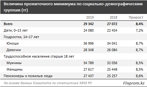 Прожиточный минимум трудоспособного населения старше 18 лет выглядит следующим образом: у мужчин — 34,8 тыс. тг (годом ранее — 32,1 тыс. тг), у женщин — 27,6 тыс. тг (годом ранее — 25,4 тыс. тг).