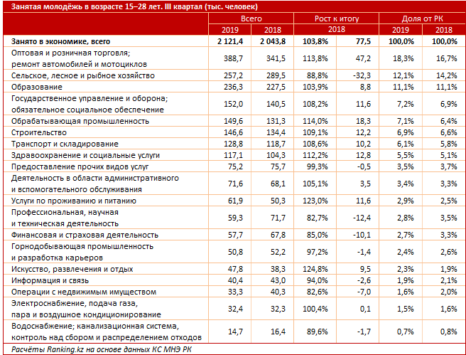 На конец третьего квартала 2019 года в Казахстане насчитывалось 2,1 млн занятой молодежи в возрасте от 15 до 28 лет — на 3,8% больше, чем в соответствующем периоде годом ранее (2 млн человек), передает piv-bank.ru со ссылкой на исследование ranking.kz.