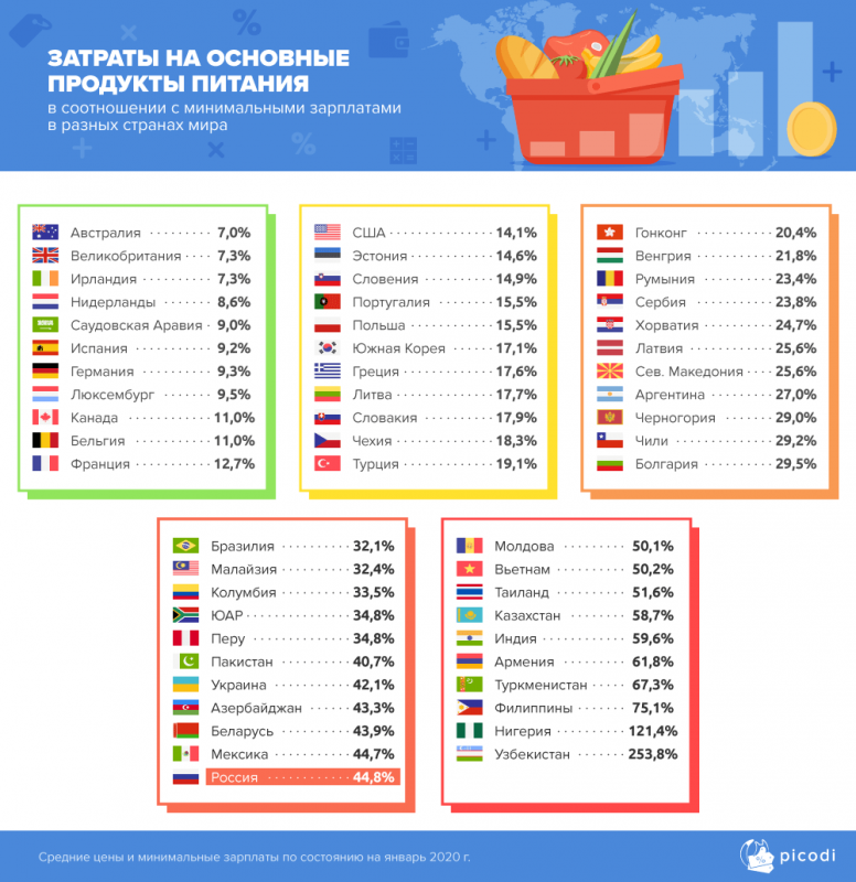 Россия находится на 44-м месте в рейтинге стран по показателю доли дохода, которую человек, получающий минимальную зарплату, будет отдавать за базовую продуктовую корзину. Такие данные приводятся в исследовании компании Picodi.com о динамике минимальных зарплат и минимальных расходов на питание в разных странах.