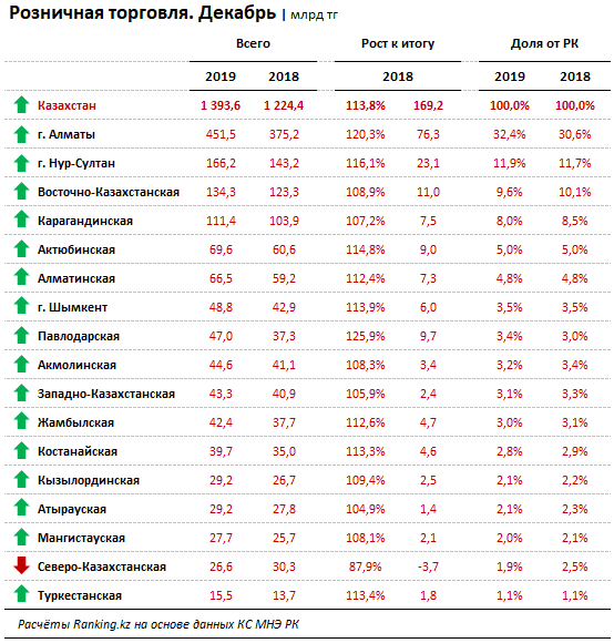 В ТОП-5 регионов по показателям ритейла также вошли ВКО, Карагандинская, Актюбинская и Алматинская области. Самые слабые показатели — в густонаселенной Туркестанской области.