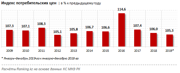 По итогам 12 месяцев прошедшего года официальный уровень инфляции к аналогичному периоду 2018-го составил 5,3%. Для сравнения, годовая инфляция в 2018 году достигала 6%, в 2017-м — 7,4%, в кризисном 2016-м — 14,6%.