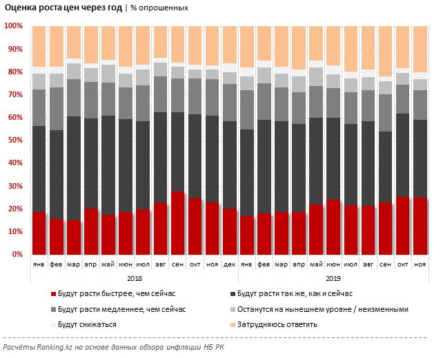 Заметим, согласно обзору инфляции Национального банка РК, в ноябре 2019 года, по данным опроса казахстанцев, 54,7% респондентов ожидали сохранения существующего темпа роста цен либо его замедления в течение следующих 12 месяцев (против 56,4% в октябре).