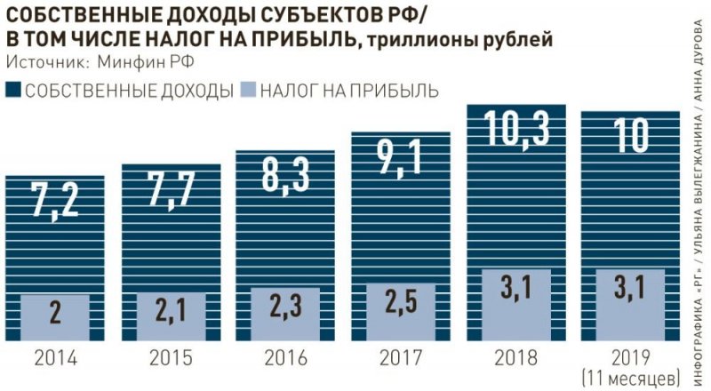 Налог на прибыль - это важнейший источник формирования доходной базы региональных бюджетов. Три процента от прибыли юридические лица перечисляют в федеральный бюджет, 17 процентов - в казну области, республики или края. Собственные доходы всех субъектов РФ с января по ноябрь 2019 года, согласно статистике федерального Минфина, составили чуть более десяти триллионов рублей. Из них 3,1 триллиона, или порядка 30 процентов, - это налог на прибыль.