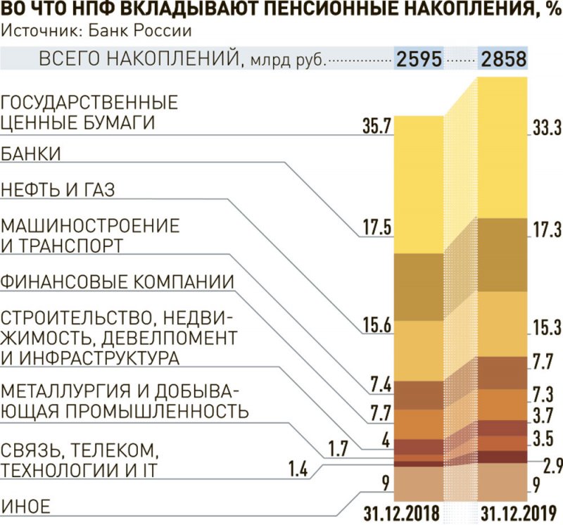 Еще пять-шесть пенсионных фондов сдадут лицензию в этом году. В 2019 году с рынка ушли пять фондовВ портфелях пенсионных накоплений сохранялась тенденция наращивания вложений в металлургию и добывающую промышленность, связь, телеком и IT, в портфелях пенсионных резервов (здесь фонды гораздо более свободны в выборе) - в машиностроение и транспорт, металлургию и добывающую промышленность. Фонды нарастили долю вложений пенсионных накоплений в реальный сектор с 35,3 до 38%, пенсионных резервов - с 28,7 до 33,5% (за счет сокращения вложений, соответственно, в госсектор и финансовый сектор).
