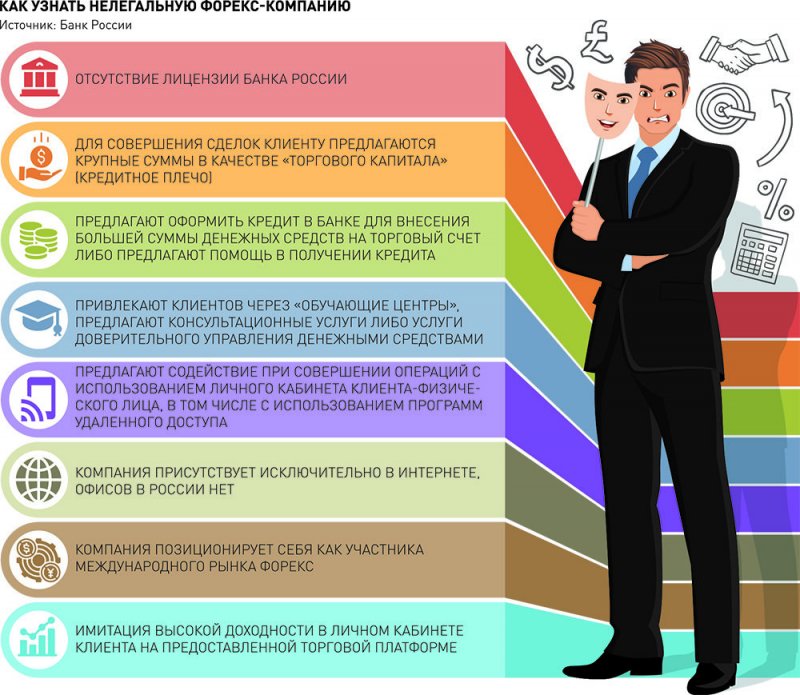 Стать клиентом нелегального форексера просто - цена "входного билета" невысока, регистрация торгового счета с телефона занимает меньше минуты, паспорт не нужен, никто толком не предупредит о рисках. Хотя даже небольшие колебания курса базовой валюты могут привести к потере всех вложений, поскольку торговля идет с кредитным плечом. Форекс-дилер предоставляет, скажем, 50 долларов на каждый 1 доллар клиента, и тогда, имея 2 тыс. собственных долларов, он может совершить сделку на 100 тыс. - пропорционально растут и потенциальная прибыль, и убыток. Учитывая это, ЦБ хочет ограничить сумму, которой могут рискнуть большинство граждан у форекс-дилера. Но это повлияет только на легальную часть рынка.