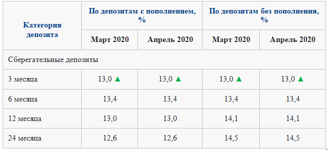 Таким образом, срочные вклады на 3 и 6 месяцев повысились с 10,3% до 13%, сберегательные вклады на 3 месяца - с 12,7% до 13%.