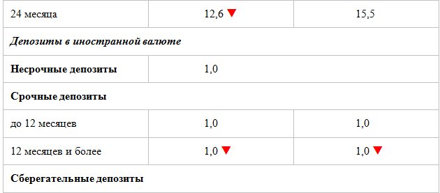 • по сберегательным депозитам на 3, 6 месяцев, год и два года до 13,0%, 13,4%, 13,0% и 12,6% соответственно;