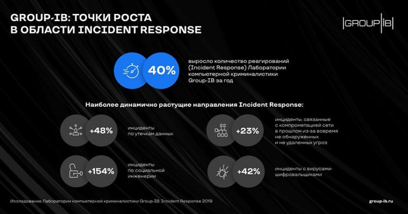 Тем не менее, укрепление защиты цифровых рубежей банков вынудило киберкриминал искать новые каналы вывода информации, отмечают в Group-IB. Так, за год количество даркнет-сервисов по продаже выгрузок клиентских данных выросло на 55%. Такие выгрузки, как правило, нужны мошенникам, использующим методы социальной инженерии. Обычно данные «сливает» инсайдер с невысоким уровнем доступа, не имеющий возможности выгрузки CVV/CVC, полного номера карты и др. Еще одним важным трендом прошлого года специалисты Group-IB называют инциденты с вирусами-шифровальщиками. Количество пострадавших от них организаций выросло на 42%. При этом, кроме вымогательства, целью большинства операторов вирусов-шифровальщиков стала выгрузка данных из скомпрометированных сетей. Эксперты Group-IB зафиксировали рост запросов на реагирования, связанных с инцидентами по утечками данных, на 48%, с социальной инженерией — на 154%, с фактами «долгосрочной» компрометации корпоративной инфраструктуры из-за вовремя не обнаруженных и не удаленных угроз — на 23%.