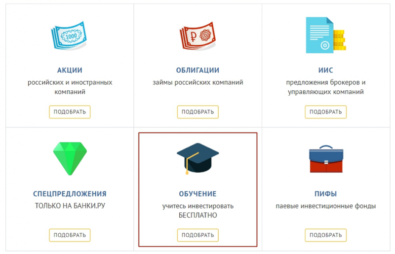 Если вы не хотите выбирать ценные бумаги самостоятельно, то можете воспользоваться готовым решением и прямо через Банки.ру купить паевые инвестиционные фонды или вложить деньги в структурные продукты. Важно не просто вслепую купить пай фонда, но предварительно узнать все про сами ПИФы, их стратегию и доходность. Такая возможность также есть в разделе «Инвестиции» на Банки.ру.