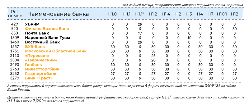 Значения Н1.1 у Почта Банка были 17 раз за месяц ниже 7,0% (наиболее низкое значение — 6,846%), у «Восточного» и УБРиР — по 29 дней месяца (наиболее низкие значения — 6,018% и 6,186% соответственно).