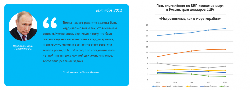 Вообще-то войти в пятерку крупнейших экономик мира — и уже без оговорок про ППС — мы тоже пытались. Эту цель Владимир Путин озвучил шестью годами раньше, в «майских указах» от 2012 года. Президент говорил тогда о необходимости «раскрутить маховик экономического развития, темпов роста до 6–7% в год» и называл это «абсолютно реальной задачей».