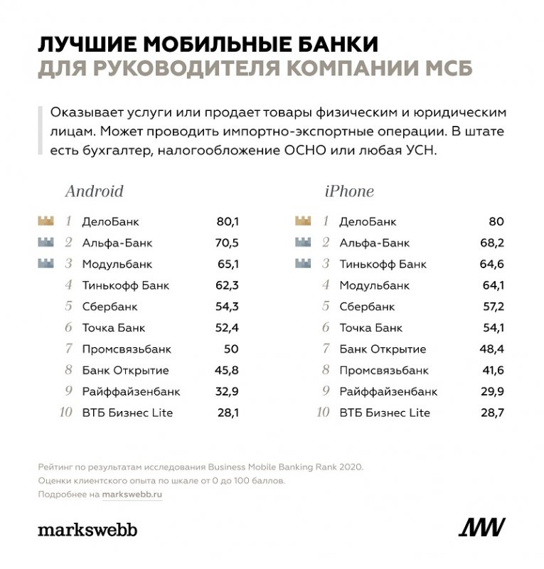 Первую строчку во всех четырех рейтингах занял ДелоБанк. Авторы подчеркивают: чтобы занять позицию лидера, недостаточно просто расширять возможности приложения. «Необходимо продумывать нюансы пользовательского опыта и поддерживать соответствующий уровень удобства: строить грамотные контекстные связи между документами, помогать проходить через сложные процессы, например валютный контроль, и подключать сложные продукты, объясняя детали и требуя минимум действий от клиента», — поясняют в Markswebb.