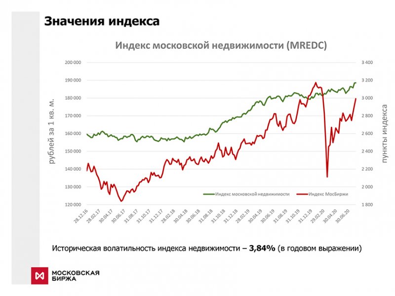 Индекс московской недвижимости MREDC — это индикатор средней стоимости квадратного метра жилой недвижимости в Москве на основе реальных ипотечных сделок Сбербанка. Он рассчитывается еженедельно по сделкам за четыре последние недели. Сейчас индекс представлен в ретроспективе с 2016 года. Пока он считается лишь по данным о московской недвижимости, но в дальнейшем Мосбиржа и «ДомКлик» планируют расширять географию, данные для этого есть.
