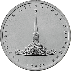 На оборотной стороне второй монеты изображен «Памятник воинам Советской Армии — освободителям Курильских островов в 1945 г.»; по окружности имеются надписи: «Курильская десантная операция» и «1945 г.».
