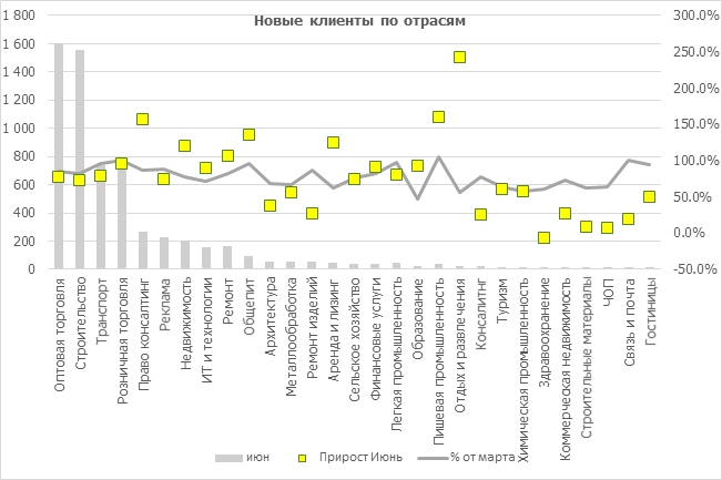 Положение малого бизнеса различается в зависимости от отрасли. В июне быстрее остальных возвращались к активному использованию банковских продуктов предприятия, работающие в сфере отдыха и развлечений, юриспруденции, общепита и пищевой промышленности.