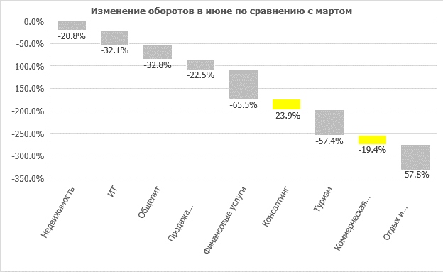 По сравнению с мартом обороты в тех же секторах остаются низкими. Заметнее всего эта тенденция в сфере финансовых услуг, туризма и развлечений.