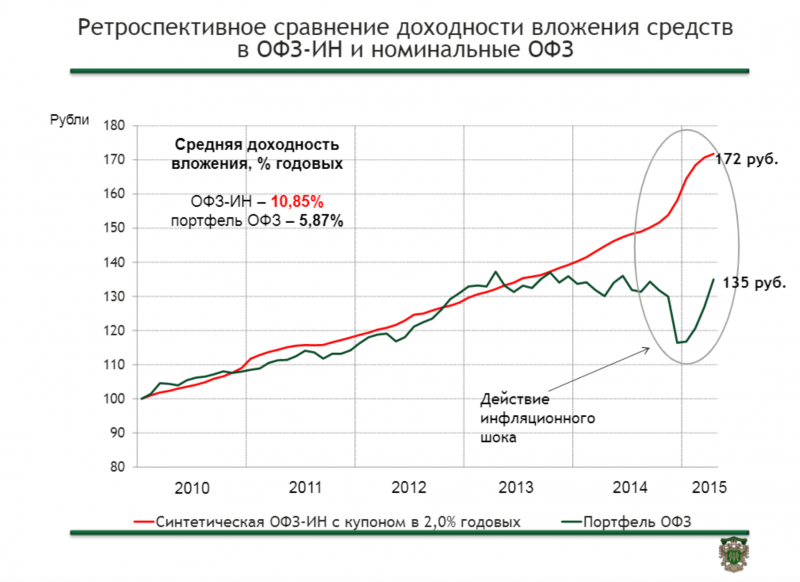 На этой же презентации Минфин показал весьма наглядные графики, как работает защита. Ретроспективная модель вложений в ОФЗ-ИН против портфеля номинальных ОФЗ показывает, как в момент инфляционного скачка во второй половине кризисного 2014 года «провалились» номинальные ОФЗ и «выстояли» ОФЗ-ИН.