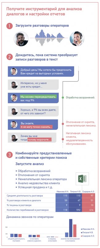 — С помощью речевой аналитики можно настраивать и отслеживать любые показатели: длительность звонка, отработку возражений, отклонение от скрипта, успешные продажи, негативную лексику, слова-паразиты, повторные обращения и многое другое. Доступен анализ количественно-временных и лексико-семантических параметров речи: процент участия в разговоре каждой из сторон диалога, количество перебивании, процент тишины, упоминание конкурентов и продуктов конкурентов, а также попытки перевести разговор с клиентом на другой телефон.