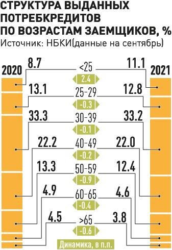 Число ссуд, предоставленных гражданам до 25 лет, - единственная категория, показавшая рост. На них пришлось 11,1% всех потребкредитов. Количество потребзаймов, выданных гражданам 25-29 лет, снизилось на 12,2%, 30-39 лет - на 10,6%, 40-49 лет - на 11,2%, 50-59 лет - на 16,4%, 60-65 лет - на 17%, старше 65 лет - на 22,9%.