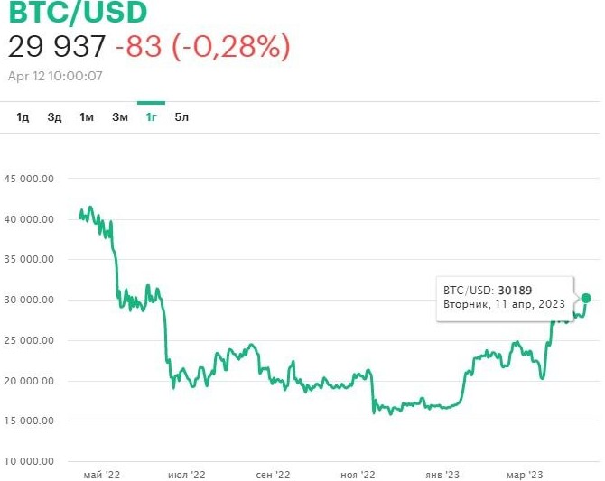 Утром 12 апреля цена на BTC несколько снизилась, на 0,28%, поднявшись к обеду вновь до 30 тыс. долларов и в настоящее время движется в боковом тренде.
