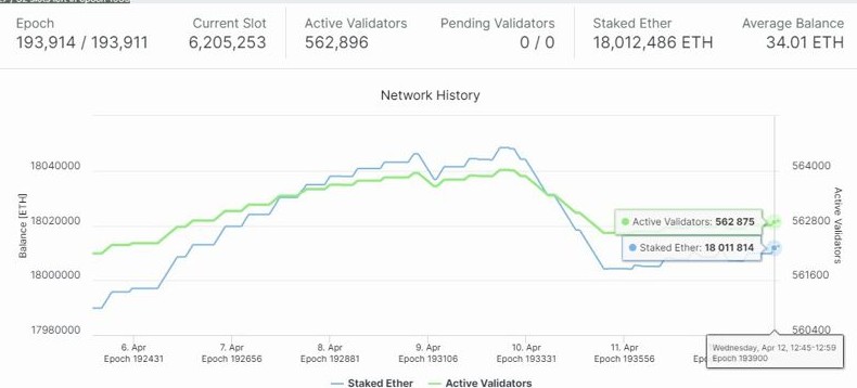 По данным сервиса beaconcha.in, на момент написания этого материала в блокчейне действует 562 801 валидатор. На депозитном контракте находится свыше 18 млн ETH, а средний баланс валидатора оценивается в 34,01 ETH. Однако согласно документации проекта сразу вывести все средства не предоставляется возможным, лишь до 8 валидаторов в день, что эквивалентно 57,6 тыс. ETH, или 110,5 млн долларов.