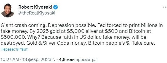Автор бестселлера "Богатый папа, бедный папа" и предприниматель Роберт Кийосаки в своих твиттах не устает повторять о необходимости покупать, пока системная инфляция не взята под контроль. Еще в феврале 2023 года он повторил свой прогноз о "гигантском крахе в истории" и приближающейся депрессии и призвал покупать криптовалюты.