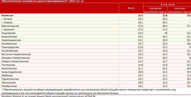 При этом в 12 из 20 крупнейших регионов страны показатель обеспеченности жильем находится ниже среднереспубликанского значения. В меньшей степени обеспечено жильем население Жамбылской, Жетысуской и Туркестанской областей.