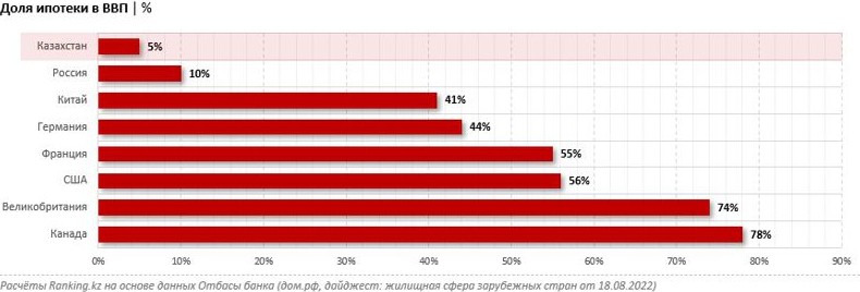 Таким образом, все говорит о том, что ипотечный рынок Казахстана находится в стадии развития. Если рассмотреть отношение портфеля ипотечного кредитования к ВВП, то в Казахстане оно составляет 5%, в то время как в России – 10%, в Китае – 41%, в Германии – 44%, во Франции – 55%, в США – 56%, в Великобритании – 74%, в Канаде – 78%. То есть по сравнению с другими странами мы видим, что до "потолка" рынка Казахстану далеко, и есть куда стремиться.