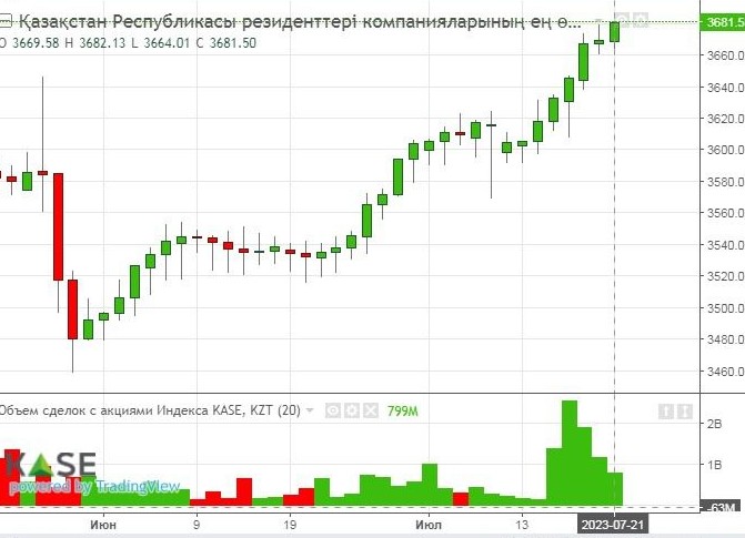 Индекс KASE пошел в рост с 12 июля после просадки во вторник 11 июля на прошлой неделе по причине фиксации дивидендов компании Казатомпром.