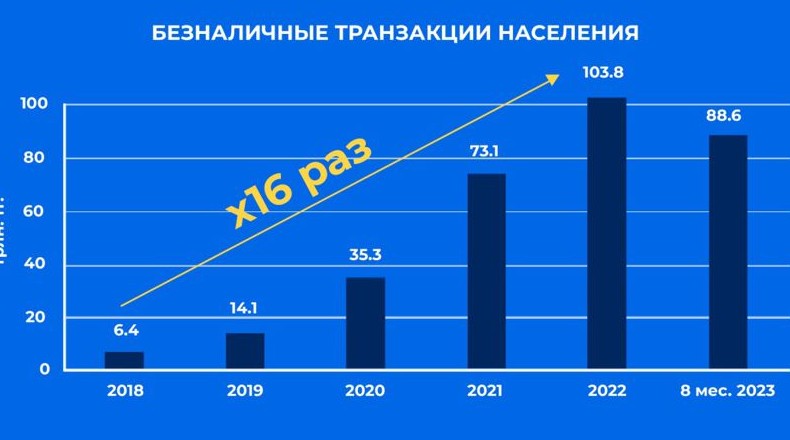 Начиная с 2018 по 2022 год безналичные транзакции населения увеличились в 16 раз. Так, если в 2018 году пользователи проводили транзакции на сумму в 6,4 трлн тенге, то на конец 2022 года это число выросло до 103,8 трлн тенге. По итогам 8 месяцев 2023 года – 88,6 трлн тенге.