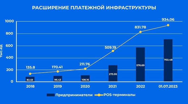 Также растет и карточная инфраструктура. Количество POS-терминалов выросло в 7 раз. При этом число предпринимателей, принимающих безналичные платежи, выросло в 8 раз за последние пять лет.