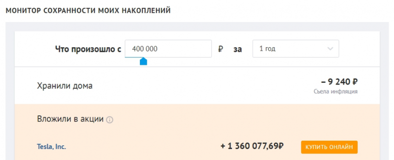 Далее обратите внимание на раздел «Монитор сохранности моих накоплений». Этот сервис позволяет увидеть, что случилось бы с конкретной суммой за тот или иной срок при вложении в акции. Например, 200 тыс. рублей, вложенные шесть месяцев назад в акции компании «Полюс Золото», принесли бы 99 418 рублей — почти 50% доходности за полгода.