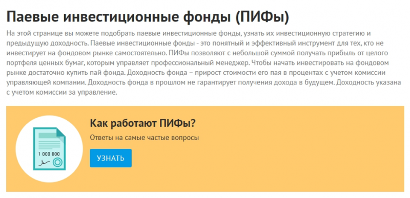 Если вы не хотите выбирать ценные бумаги самостоятельно, то можете воспользоваться готовым решением и прямо через Новости Банков купить паевые инвестиционные фонды или вложить деньги в структурные продукты. Важно не просто вслепую купить пай фонда, но предварительно узнать все про сами ПИФы, их стратегию и доходность. Такая возможность также есть в разделе «Инвестиции» на Новости Банков.