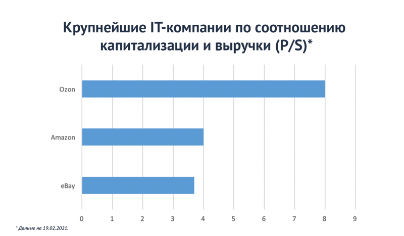 Ozon сейчас торгуется на уровне P/S равном 8, тогда как у крупнейших мировых аналогов — Amazon и eBay — мультипликатор не превышает 4. Такая разница в P/S объясняется тем, что темпы ожидаемого роста выручки Ozon существенно выше, чем у его именитых конкурентов.