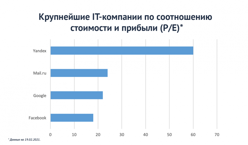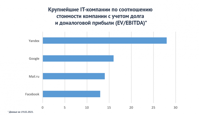 Две другие компании — Mail.ru и «Яндекс» — лучше сравнивать с их мировыми аналогами по мультипликаторам EV/EBITDA и P/E.