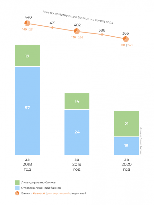 Итого к 1 января 2021 года в России осталось 366 действующих банков. 248 участников рынка располагали универсальной лицензией, еще 118 — базовой, предполагающей упрощенные требования к раскрытию информации и предоставлению отчетности.