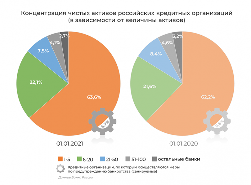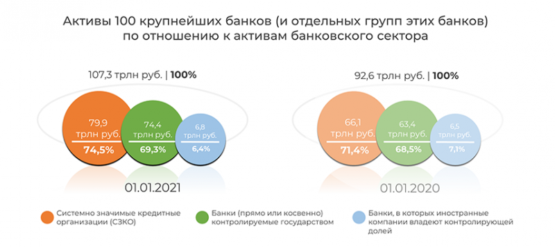 Крупнейшие банки с прямым и косвенным государственным контролем остаются ведущими участниками российского банковского рынка, транслируя не только поддержку в виде государственных субсидий, но и другие меры, не всегда выгодные кредитным организациям и влияющие на ситуацию на рынке в целом. Кроме того, пока санация не приносит ощутимой выгоды (сроки продажи Азиатско-Тихоокеанского Банка и Банка «ФК Открытие» снова перенесены), лишь увеличивая концентрацию активов на крупнейших организациях с доминированием госбанков.
