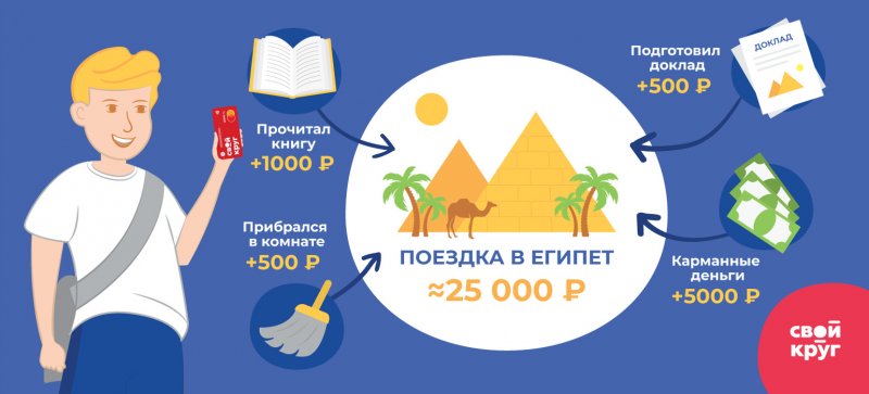 Вот простой пример. Школьник Костя мечтает увидеть пирамиды и копит на путевку в Египет (25 тыс. рублей). Родители, желая помочь сыну, установили для него в приложении «статьи дохода»: за факультативный доклад в школе — 500 рублей, за месяц уборки в своей комнате без напоминаний — 500 рублей (с напоминанием — 150 рублей) и за прочтение книги о Египте — 1 тыс. рублей. Каждый раз, когда Костя выполняет задание, один из родителей подтверждает это в приложении, и в копилку ребенка автоматически зачисляется вознаграждение. Таким образом, за месяц Костя может зарабатывать до 2 тыс. рублей. Кроме того, родители ежемесячно размещают на его счете 5 тыс. рублей на мелкие расходы. Если этот лимит не будет использован, деньги автоматически попадут в копилку. Косте нравится зарабатывать и распоряжаться деньгами, как взрослому! Он видит, что приближается к цели и через год сможет осуществить свою мечту.