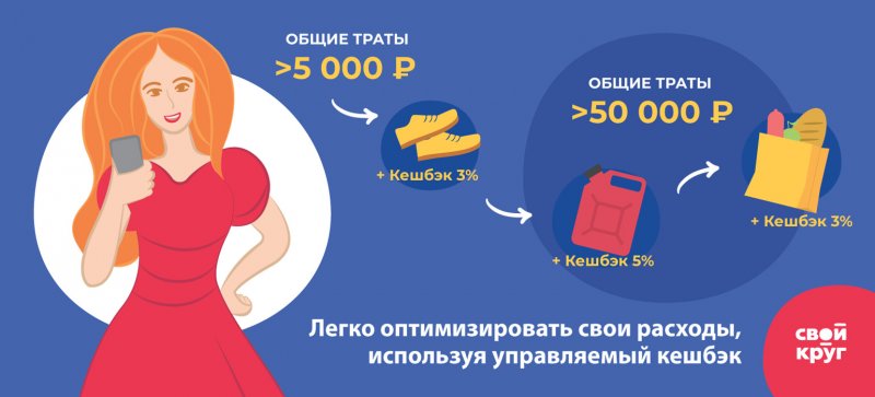 Когда сумма трат достигает 5 тыс. рублей, владельцу пакета «Свой круг» открывается десять категорий повышенного кешбэка. Он может выбрать одну из категорий: «Детские товары», «Салоны красоты», «Кино и театры», «Косметика», «Развлечения и спорт», «Животные», «Книги», «Парковки», «Цветы», «Аренда авто». Когда сумма трат в месяц достигает 30 тыс. рублей, добавляются новые категории с повышенным кешбэком: «Смотри дома», «Медицинские учреждения», «АЗС», «Ювелирные изделия, часы», «Транспорт», «Duty Free и авиабилеты», «Железнодорожные билеты». При сумме ежемесячных трат в 50 тыс. рублей становится доступным еще ряд категорий: «Супермаркеты», «Ремонт», «Рестораны», «Бытовая техника», «Отели», «Ешь дома», «Одежда и обувь», «Аптеки», «Мебель» и «Фастфуд». Таким образом, при тратах от 50 тыс. рублей в месяц можно открыть три любых категории кешбэка из постоянного списка и максимально экономить на покупках.