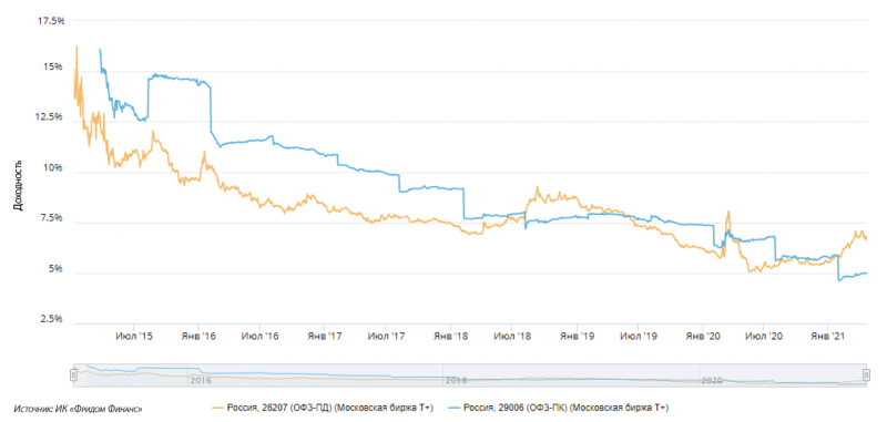 В начале 2015 года на рынок вышло два флоатера: 28 января — короткий ОФЗ-ПК 24018 с погашением в 2017 году, 11 марта — длинный ОФЗ-ПК 29006 с погашением в 2025-ом. С момента размещения и до 31 июля 2015 года, то есть до момента снижения ключевой ставки, полная доходность владения этими активами составила 24,2% для ОФЗ-ПК 24018 и 67,9% для ОФЗ-ПК 29006. Столь высокая доходность по длинному выпуску ОФЗ-ПК 29006 была достигнута из-за того, что бумага вышла на рынок по цене 85% от номинала. Инвесторы стали активно раскупать флоатер, что привело к значительному росту его цены за этот период.