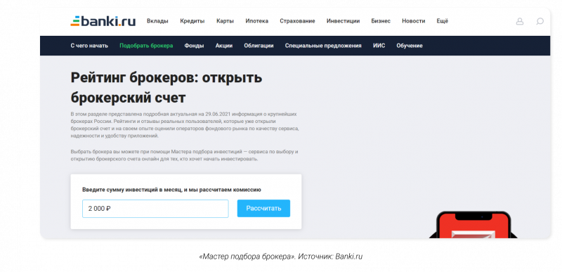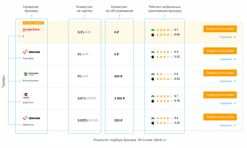 На Новости Банков есть специальный сервис для подбора брокера. Здесь можно посмотреть тарифы, рейтинги приложений и биржевых операторов.