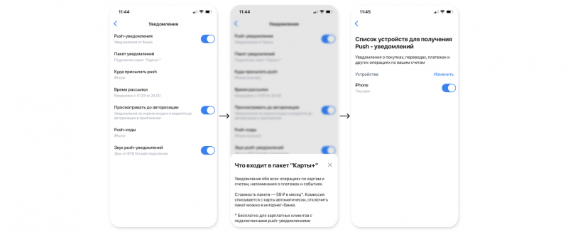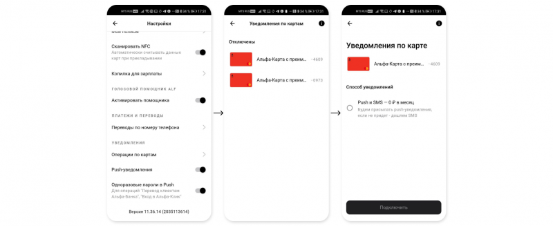 Для уведомлений о тратах по картам по-прежнему можно использовать либо СМС, либо push. Комбинация будет стоить стандартные 59 рублей в месяц, но в настройках приложения можно отключить СМС совсем, тогда push-уведомления будут бесплатны.