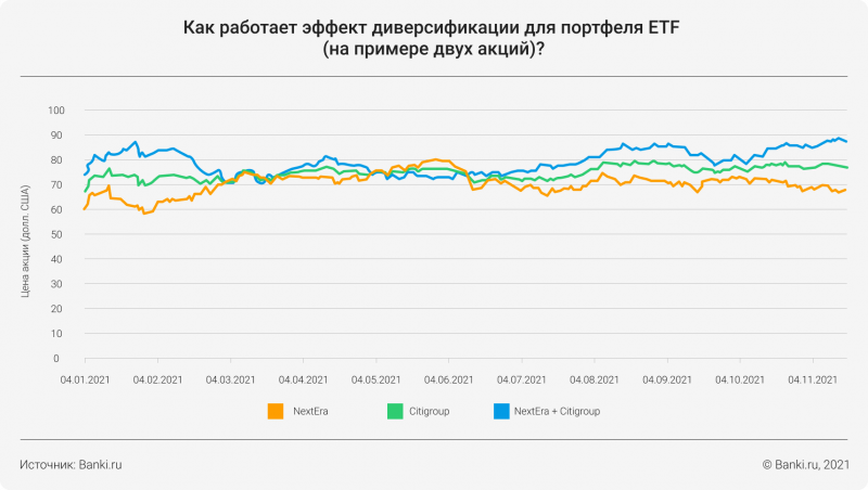 Пояснение. Верно. Эффект диверсификации возникает, когда разные акции в портфеле гасят встречные колебания друг друга: когда одни дешевеют, другие чаще всего дорожают, и наоборот. В итоге индекс, а с ним и ETF, который составлен по его подобию, несет меньше риска на просадках рынка. Но это, к слову, работает и в обратную сторону: ETF усредняет и уменьшает рост, отставая от самых быстрых акций, которые он в себя включает.