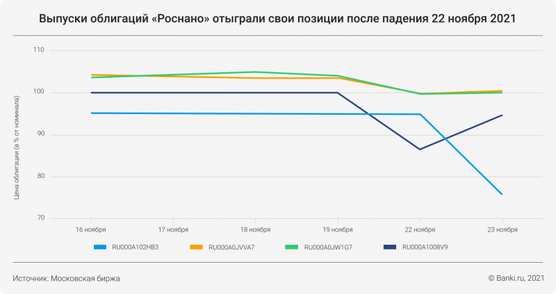 В министерстве дипломатично заявили, что правительство РФ прорабатывает механизмы повышения эффективности деятельности «Роснано», «ни один из них не предусматривает невыполнения долговых обязательств». Котировки двинулись вверх, однако полностью потери, которые у некоторых выпусков достигали 20%, отыграть не удалось.